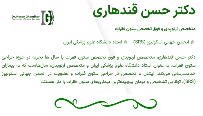 دکتر حسن قندهاری نهتنها دارای بورد تخصصی ارتوپدی، بلکه یکی از معدود پزشکانی است که با تلفیق دانش آکادمیک، تجربه عملی و اخلاق حرفهای، توانسته اعتماد بیماران زیادی را به خود جلب کند. او به عنوان جراح ستون فقرات و مفاصل، در درمان مشکلات حاد و مزمن اسکلت بدن، از جمله بیماریهای ستون فقرات، تعویض مفصل، آرتروز پیشرفته و اسکولیوز، عملکردی بینظیر دارد.