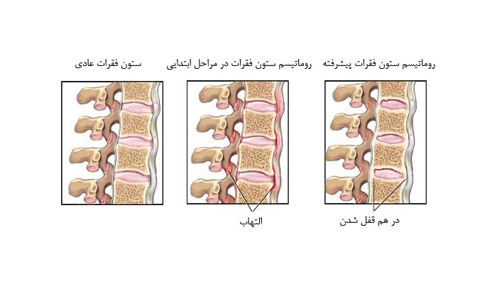 - در مراحل پیشرفته بیماری، میتوان جوش خوردن مهرههای ستون فقرات و تغییرات استخوانی را در عکسهای رادیولوژی مشاهده کرد.